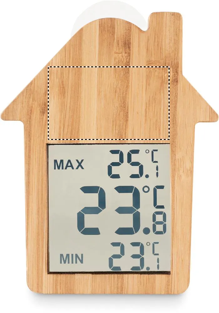 Estação meteorológica de bambu em forma de casa com ventosa na parte de trás. 1 bateria LR44 incluída. O bambu é um material natural, a cor do item, o tamanho e a impressão podem variar.Estação meteorológica