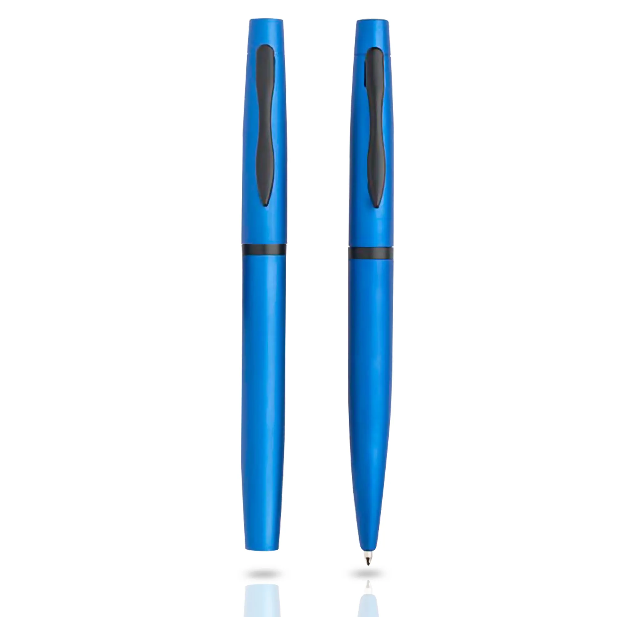 Conjunto de esferográfica e roller em metal, estojo de oferta. Um estojo de cartão com uma linha elegante, colorida conforme a cor da caneta. Incluí uma esferográfica com sistema twist e um roller com sistema tampa. Ambas de escrita azul.Conjunto de esferográfica e roller em metal, estojo de oferta