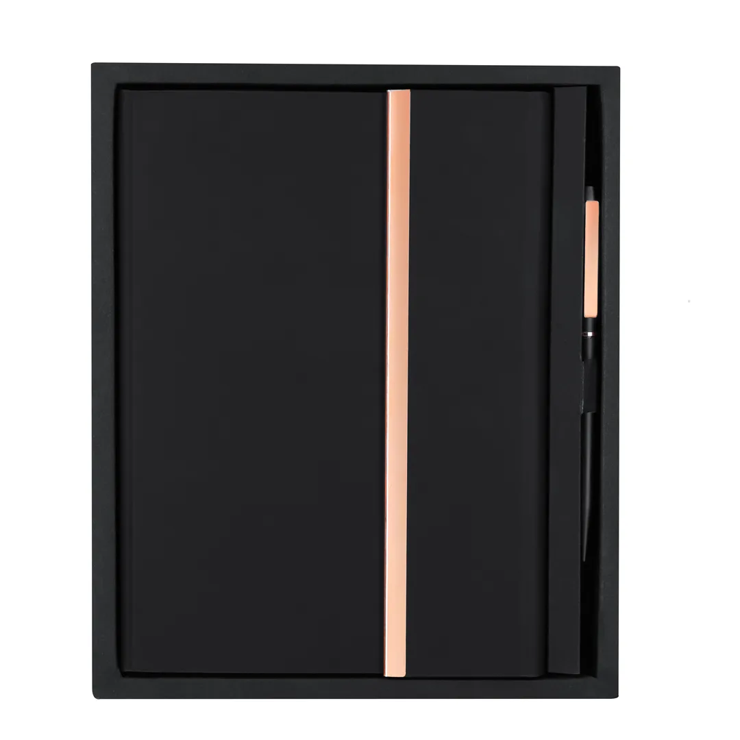 Conjunto de bloco de notas e caneta fabricados em PU Reciclado e Alumínio Reciclado. Em elegante preto fosco com acessórios distintos em acabamento ouro rosa.Bloco de notas com capa dura feita de PU reciclado, fecho magnético e acabamentos em ouro rosa. Com 80 páginas creme em layout de linhas simples, marcador de página combinando e suporte para caneta no interior, além do logotipo de PU reciclado na contracapa.O conjunto é complementado por uma caneta esferográfica de alumínio reciclado em preto fosco com detalhes em ouro rosa e clipe metálico. Mecanismo de torção e tinta azul, com logotipo de alumínio reciclado.Apresentação em um elegante estojo preto.O couro PU reciclado destaca-se pela sua resistência e elasticidade. Este material reciclável é uma opção sustentável que resgata as fibras descartadas nos processos de fabricação, minimizando o desperdício de material e contribuindo para reduzir o impacto ambiental, mantendo suas propriedades originais.O alumínio reciclado é um material com possibilidades de reciclagem quase infinitas, que mantém suas propriedades originais e consome menos energia no processo.Certificação GRS (Global Recycled Standard), garantindo a origem reciclada do material usado na fabricação do produto.Bloco de Notas PU Reciclada. Capa Rígida. 80 Folhas. Esferográfica Alumínio Reciclado Incluída