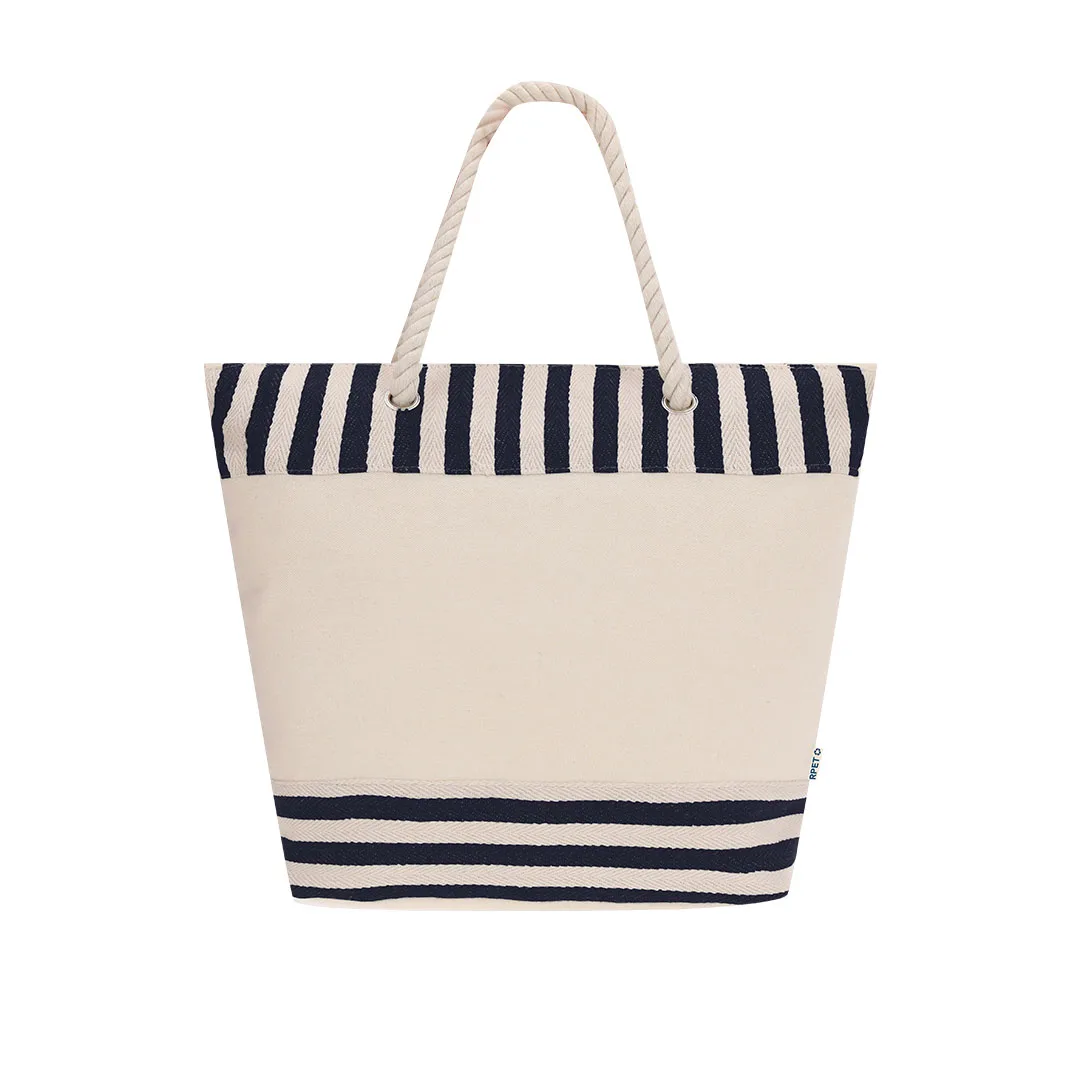 Bolsa térmica confeccionada em material RPET resistente com interior em alumínio, ideal para manter a temperatura de alimentos e bebidas.Com um design em listras naturais combinando com a cor. Inclui fechamento de zíper para maior segurança e alças longas de algodão em formato corda, reforçadas com resistentes argolas metálicas.Poliéster RPET / Alumínio