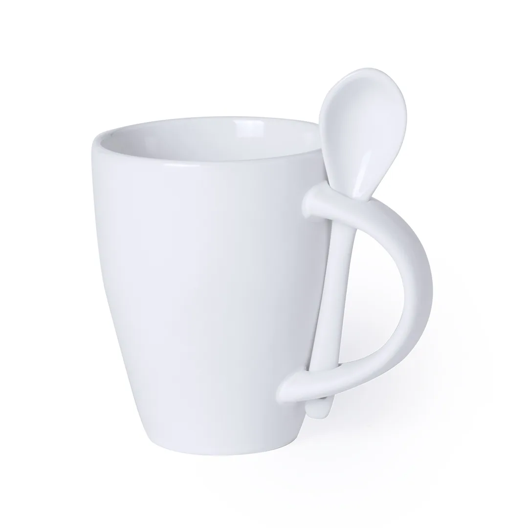 Caneca de cerâmica de 300 ml de capacidade na cor branca. Com colher de cerâmica a condizer integrada no cabo e apresentada numa caixa individual. Manual de instruções disponível em espanhol e inglês.Cerâmica300 ml