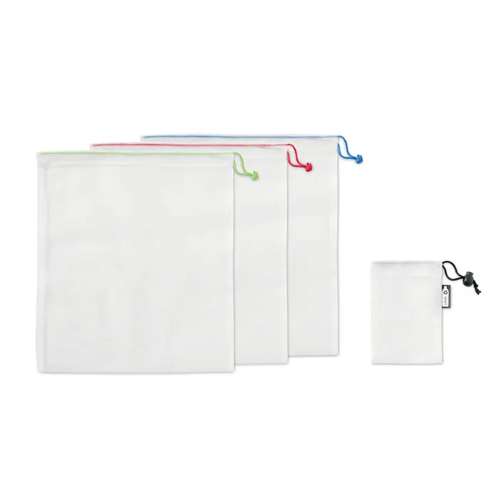 Conjunto de 3 sacos de malha RPET em bolsa RPET. Os sacos reutilizáveis são alternativa para sacos plásticos. Fecho com cordão. Apto para máquina de lavar roupa, livre de BPA e seguro para alimentos.conjunto de 3 sacos de fruta
