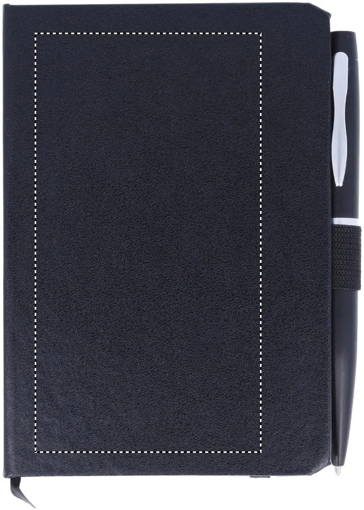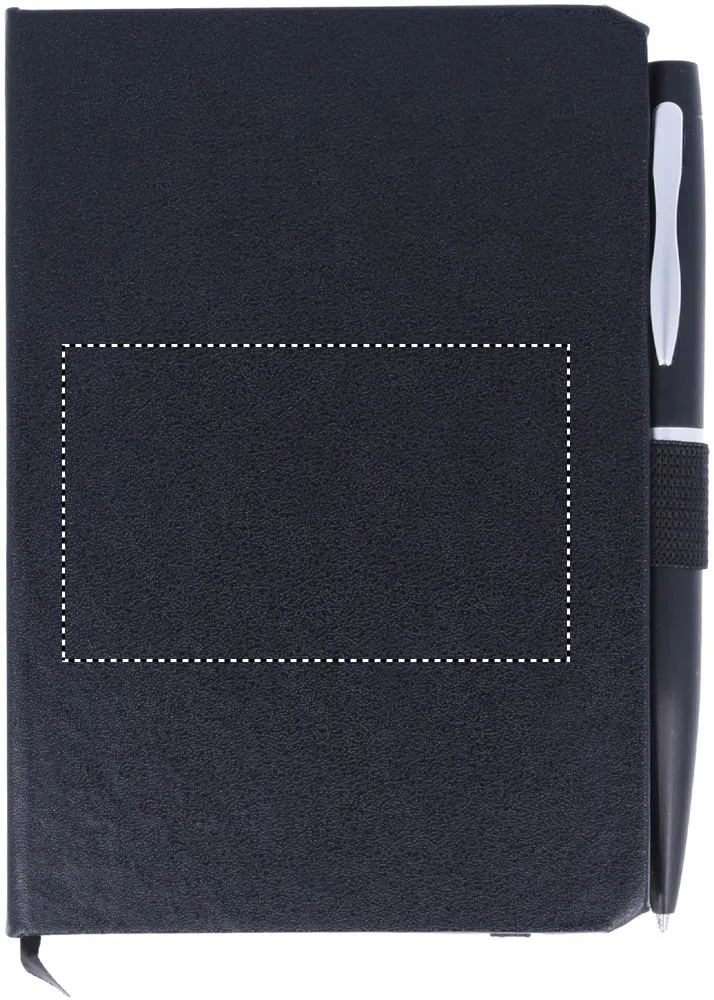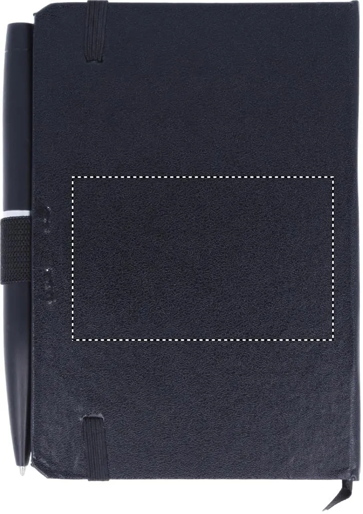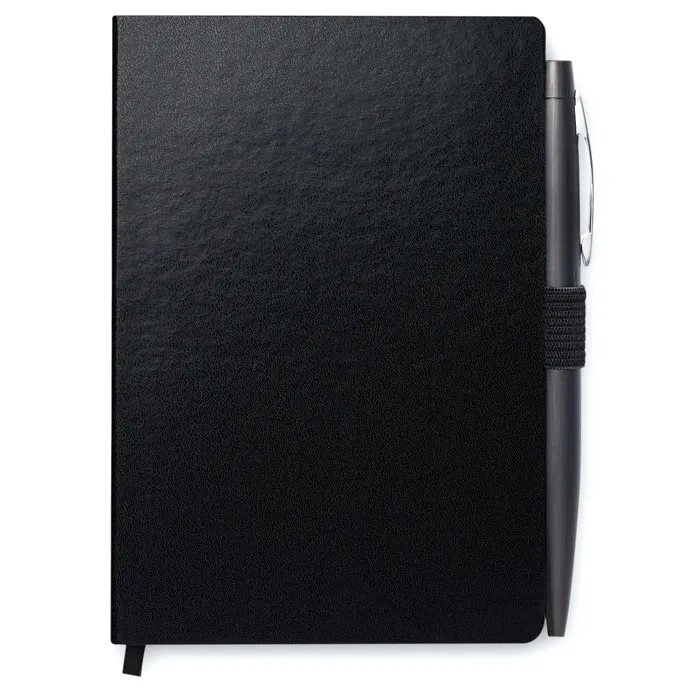 Bloco A6 com capa dura. 72 folhas pautadas. Fita elástica e marca página. Inclui caneta tinta azul.Bloco A6 com caneta