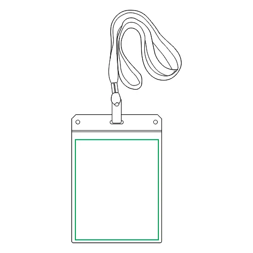 Identificador em PVC com lanyard em poliéster. O Lanyard segura o porta-credencias através de um sistema, mola, o que o torna amovível.Identificador em PVC, com lanyard em poliéster