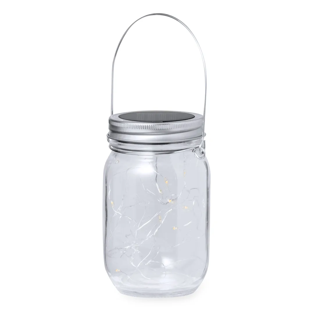 Ref: BEC90602MOOriginal lâmpada frasco solar, fabricada num resistente material vidro e com uma tira interior decorativa de 20 LEDs. Inclui tampa de rosca metálica com mini painel solar de recarga integrado e uma bateria recarregável de 300 mAh. Com prática asa para transportar ou pendurar, e apresentada numa caixa individual de design kraft.