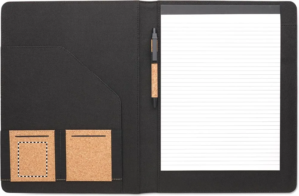 Suporte para bloco de notas A4 em cortiça. Bloco de notas A4. 25 folhas pautadas de papel reciclado. Esferográfica e porta-canetas a condizer. 2 compartimentos para cartões e um compartimento grande.Porta documentos em cortiça A4