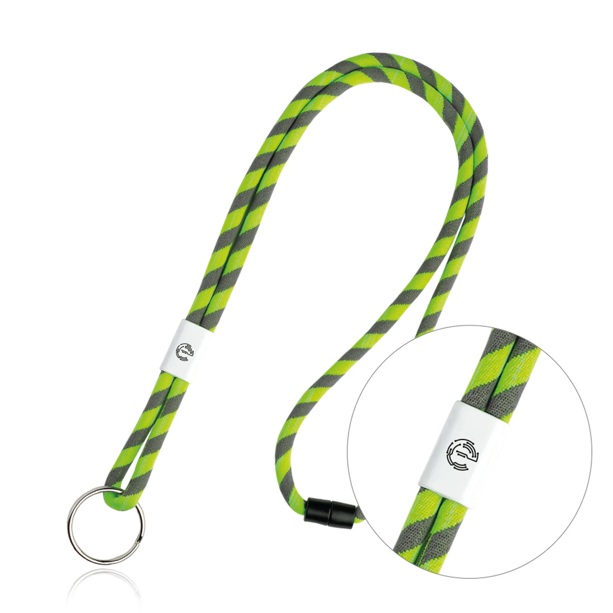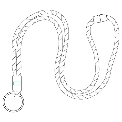 Lanyard tubular em terylene, com ajuste metálico e argola. Para além do padrão com riscas largas que variam em combinação entre o cinza e outras cores, o que destaca esta fita tubular é o seu acessório em metal que serve de ajustável e também o seu fecho de segurança.Lanyard tubular em terylene com ajuste e argola