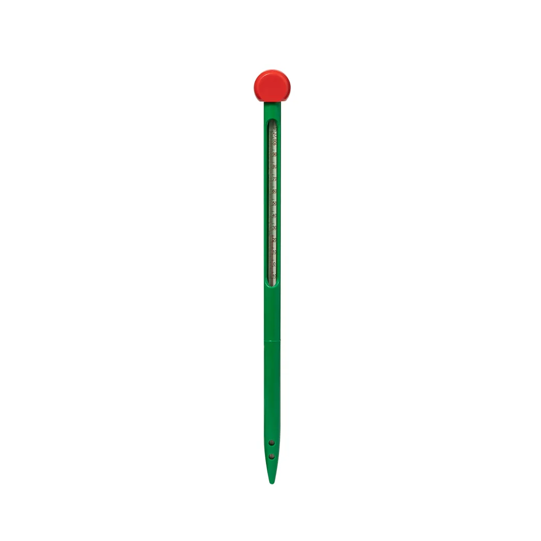 Termómetro para medir a temperatura do solo. Com sonda para introduzir no solo, leitura analógica e intervalo de temperaturas entre 0ºC e 80ºC. Apresentado numa caixa individual de design kraft.