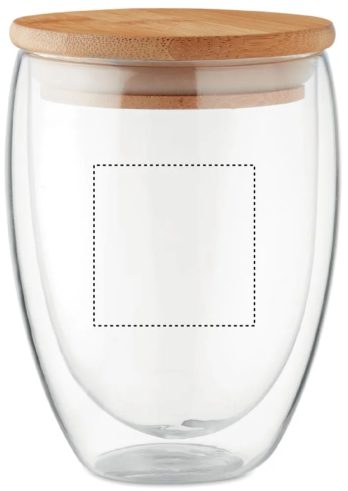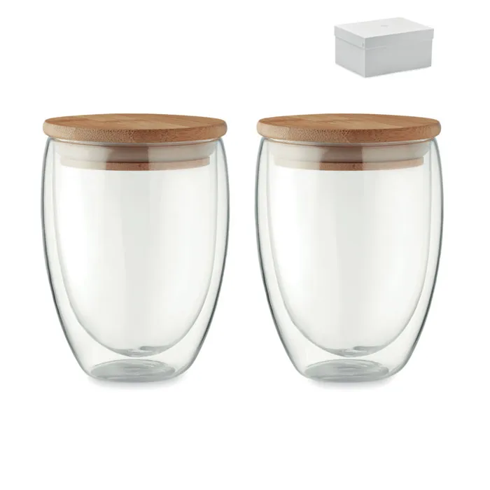 Conjunto de vidro borosilicato de parede dupla com tampa de bambu com anel de silicone. Capacidade 350 ml. Vem em caixa. O bambu é um material natural, a cor do item, o tamanho e a impressão podem variar.Set de 2 copos 350 ml