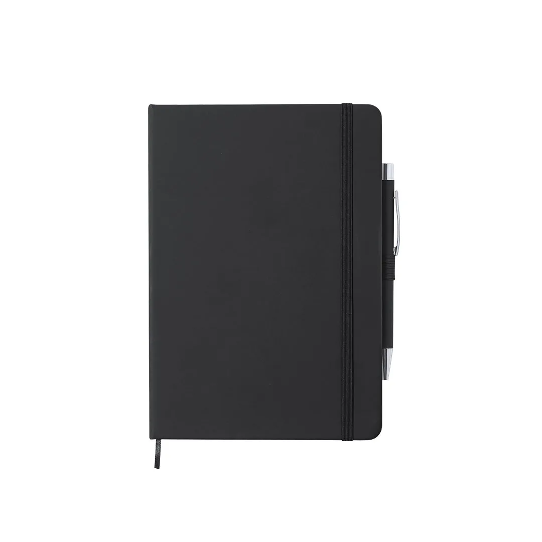 Conjunto de bloco e esferográfica a condizer. Bloco de capas rígidas com toque suave de acabamento em polipele, inclui suporte para a esferográfica, marca-páginas e fecho elástico, com interior de com 100 folhas pautadas. E também, a esferográfica de alumínio com acabamento aborrachado, com carga jumbo. Disponível numa variada gama de cores.PolipeleCapa Rígida. 100 Folhas. Esferográfica Alumínio Incluída. Carga Jumbo