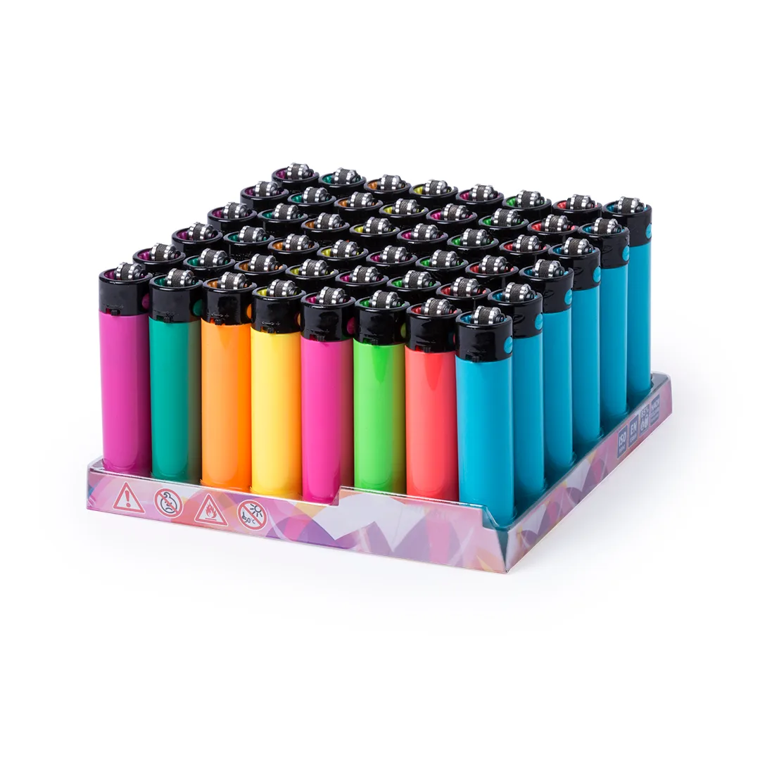 Isqueiro a gás com mecanismo de pederneira. Com proteção à criança, reabasteável, regulador de chama e acessório removível para prensagem. Fornecido em caixas de exibição de 24 unidades e em cores sólidas e variadas.Recarregável