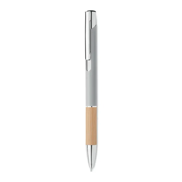 Esferográfica de alumínio com botão de pressão e pega em bambu. Tinta azul.Caneta de alumínio com bambu