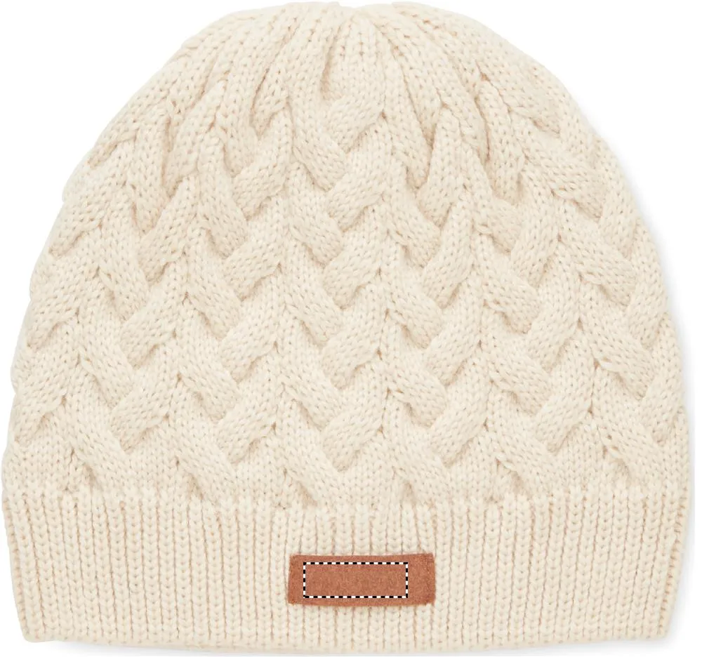 Gorro de malha de cabo em RPET com etiqueta para a área de impressão.Gorro de malha em RPET