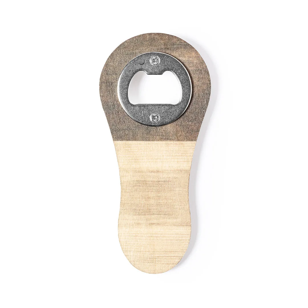 Abre-cápsulas magnético fabricado em madeira natural e de original acabamento bicolor. Com mecanismo de abertura metálico, ampla superfície de impressão e distintivo Made In Europe.