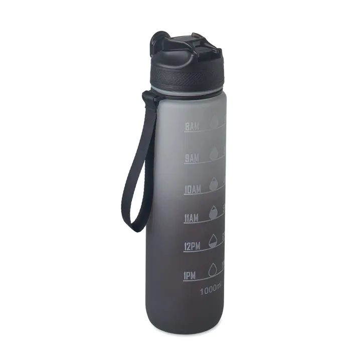 Garrafa de água desportiva RPET com palhinha integrada, bico de silicone macio, marcador de tempo motivador, tampa flip-top com uma mão, fecho de segurança e alça de transporte. Capacidade 1L.Garrafa desportiva RPET 1L