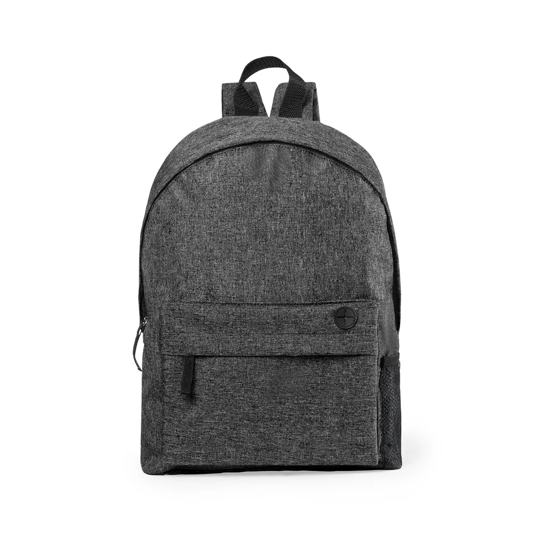 Mochila em poliéster 600D resistente com um design casual de dois tons em uma variedade de cores, com fechamento de zíper, bolso frontal com saída para fone de ouvido e bolso de malha lateral. Com cantos reforçados, pegas com fita adesiva para fácil abertura e acessórios na cor preta. Costas acolchoadas e alças de ombro ajustáveis com preenchimento.Poliéster 600DParte Traseira e Alças Acolchoadas