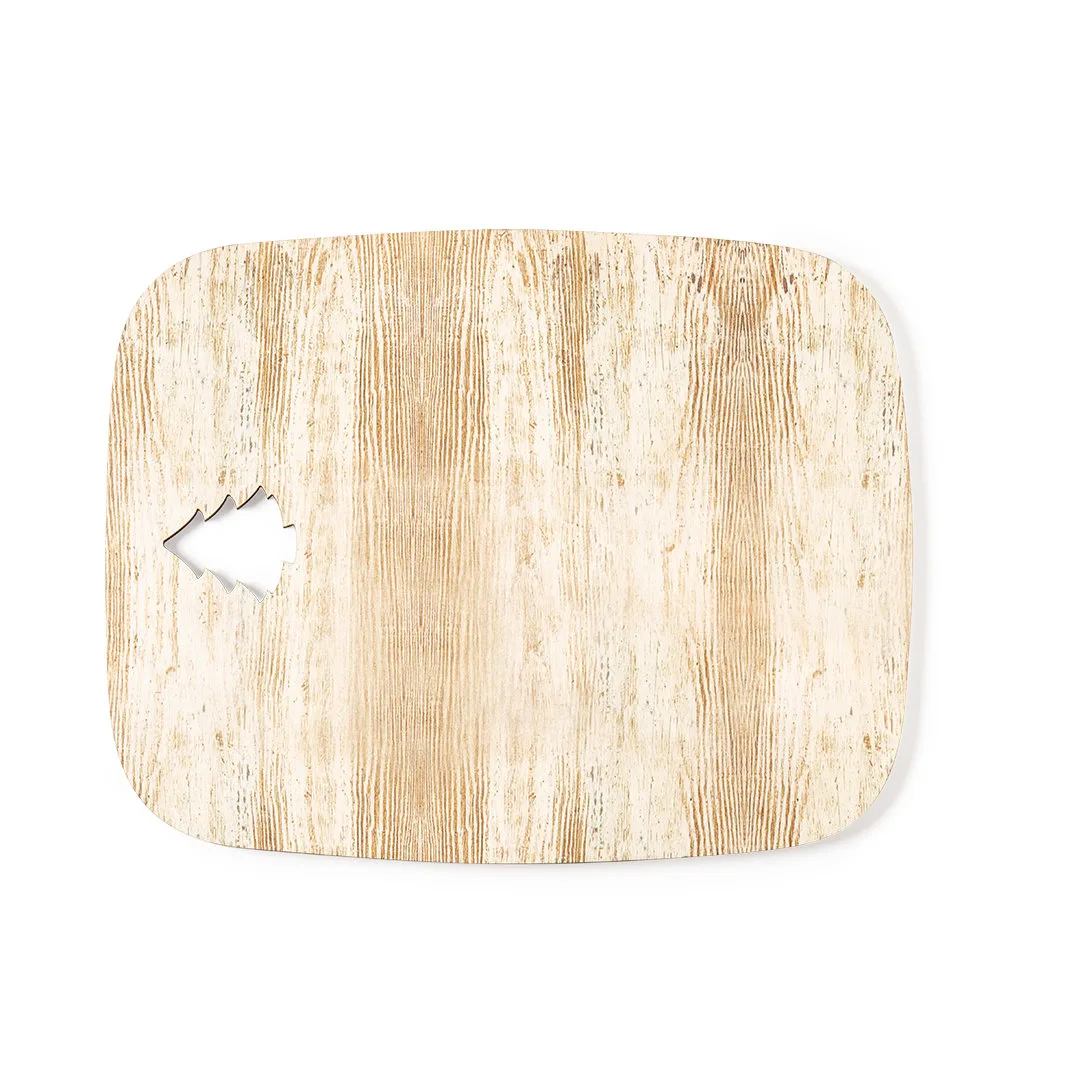 Ref: BEC9862MOTábua retangular de corte e apresentação com recorte de árvore de Natal. Fabricada em madeira natural e de original acabamento bicolor. Ampla superfície de impressão e distintivo Made In Europe.