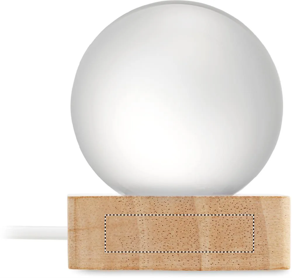 Bola de vidro com luz LED (100 lúmens) numa base de madeira com borracha. Inclui um cabo de carregamento USB (90 cm).Bola de vidro LED