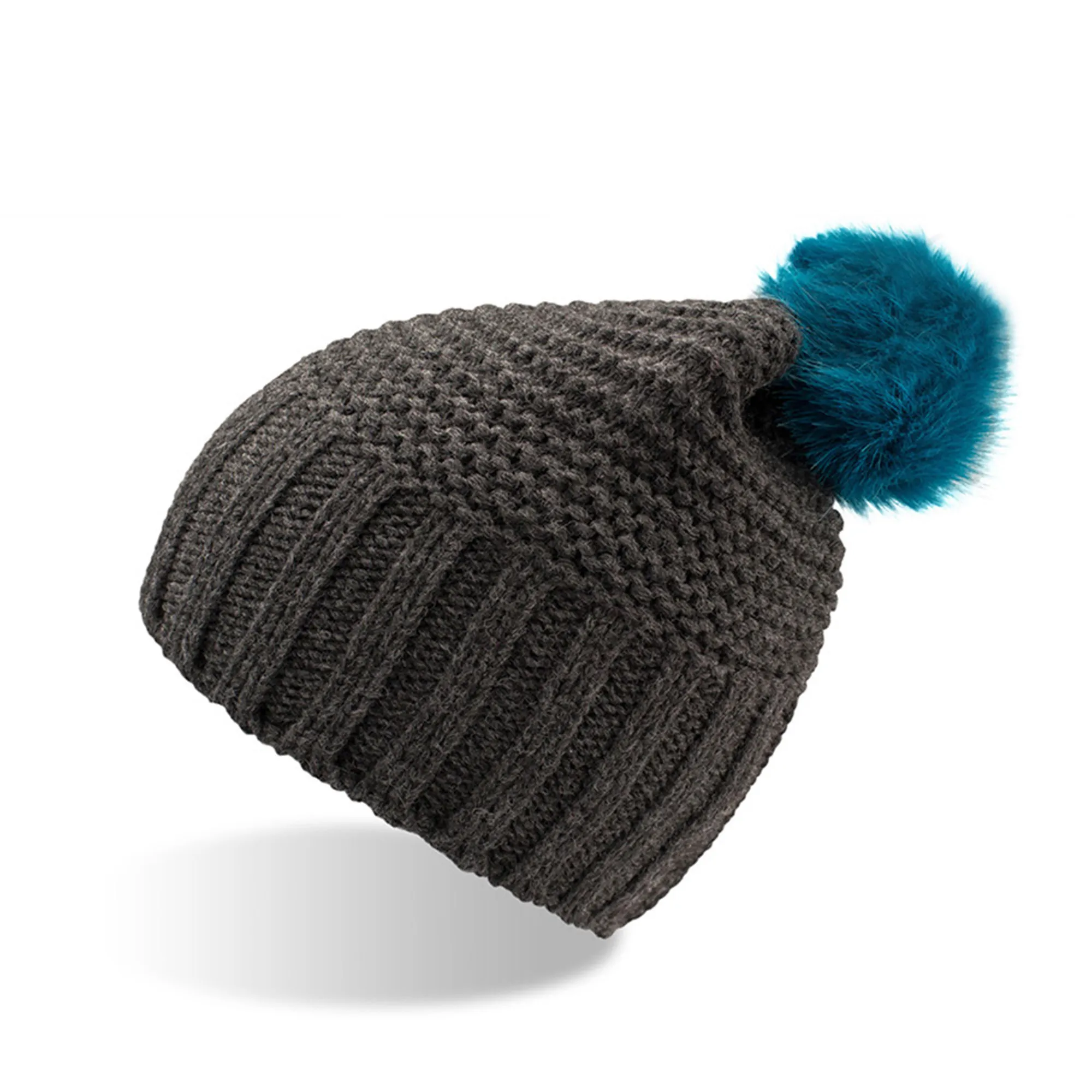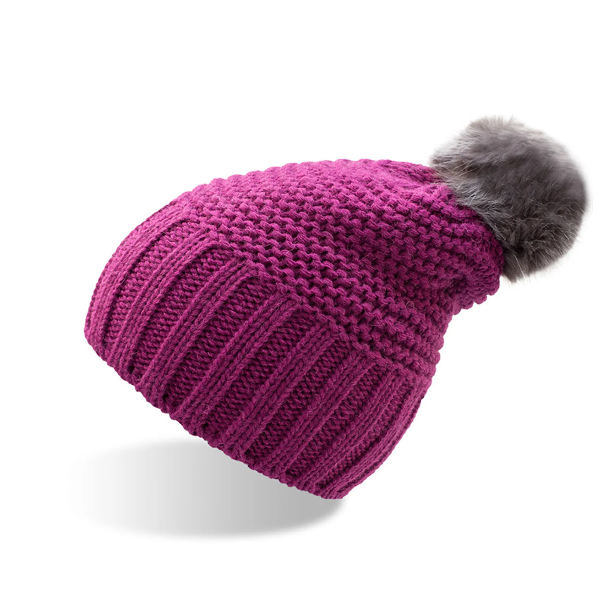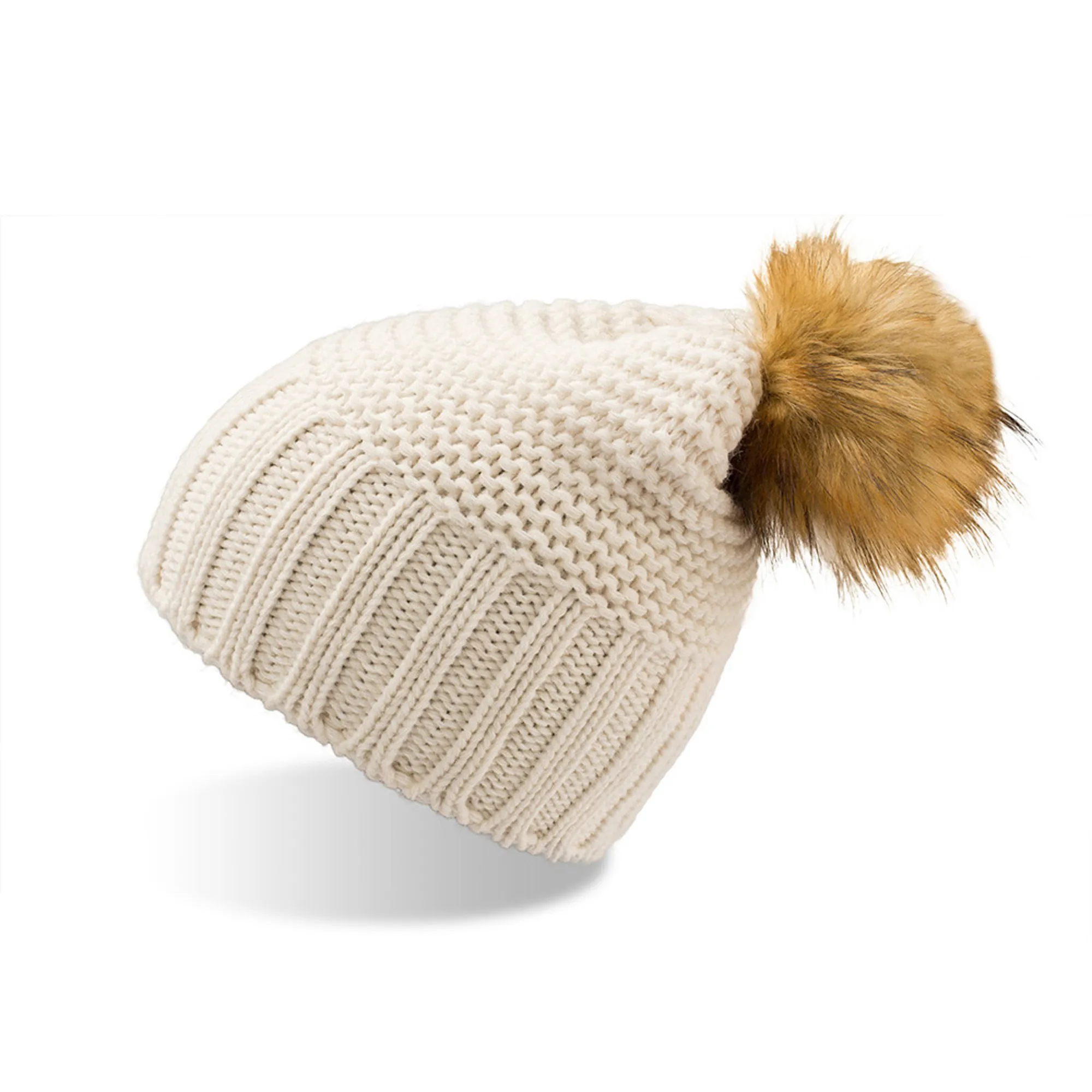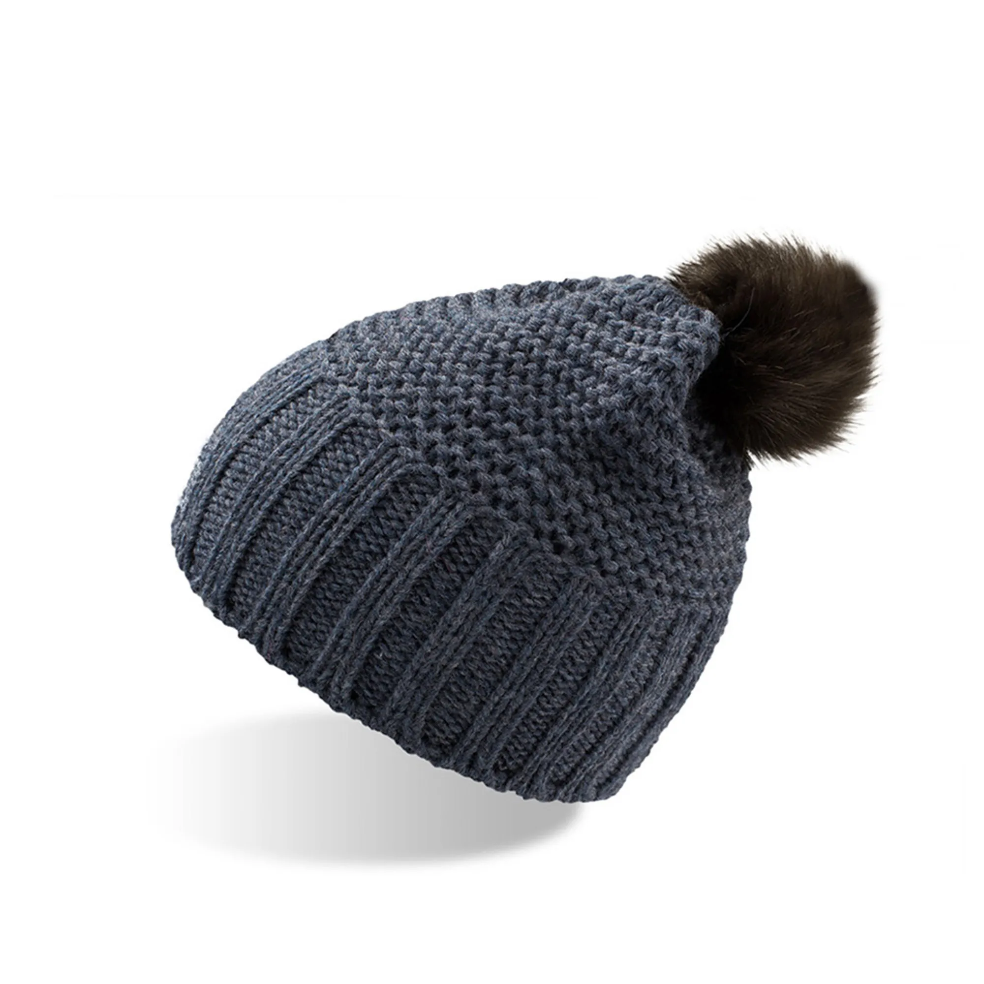 Gorro macio e elegante com pompom de pelo ecológico, com fio fabricado em Itália em lã mista.Gorro Monte Bianco, 80% acrílico/ 15% lã/ 5% viscose