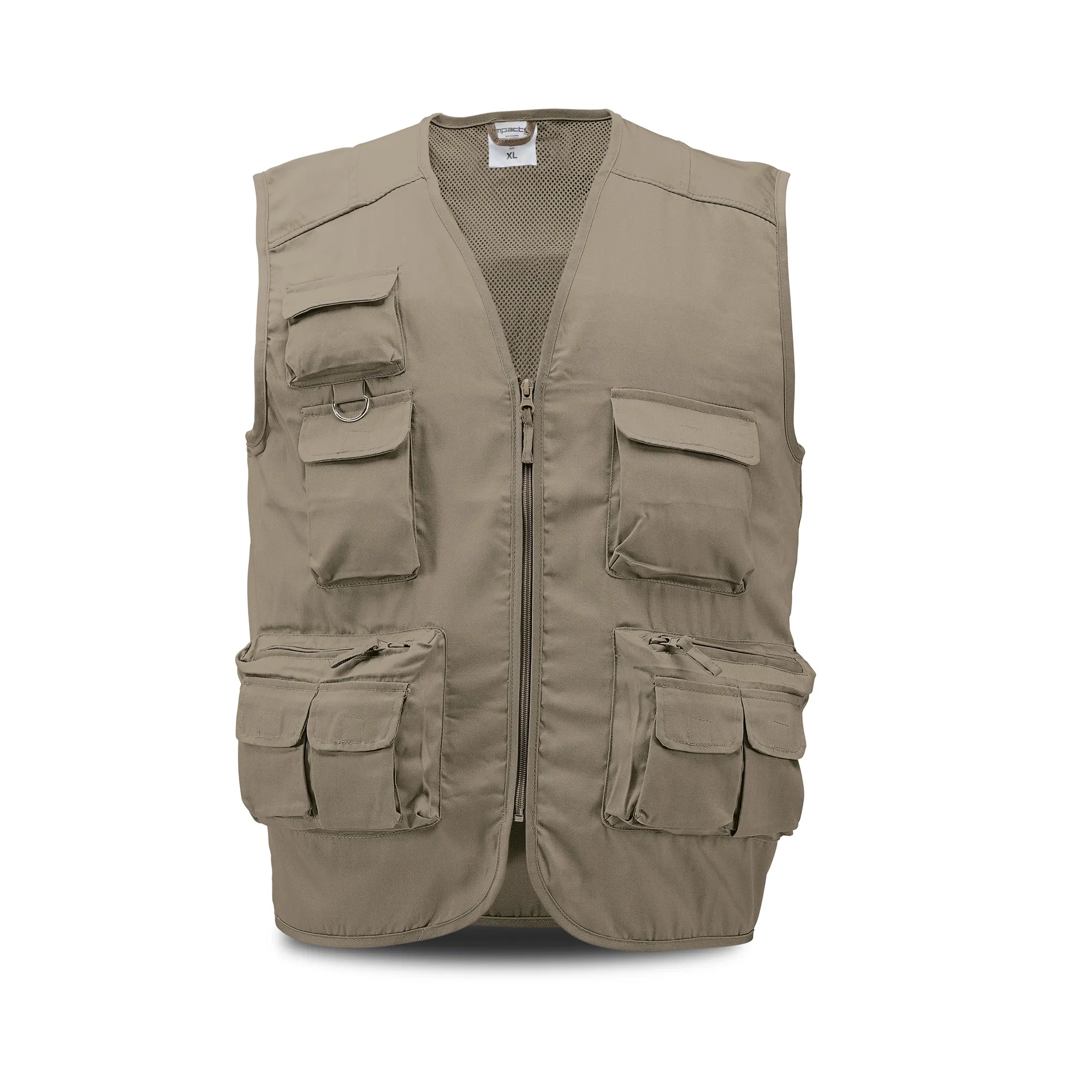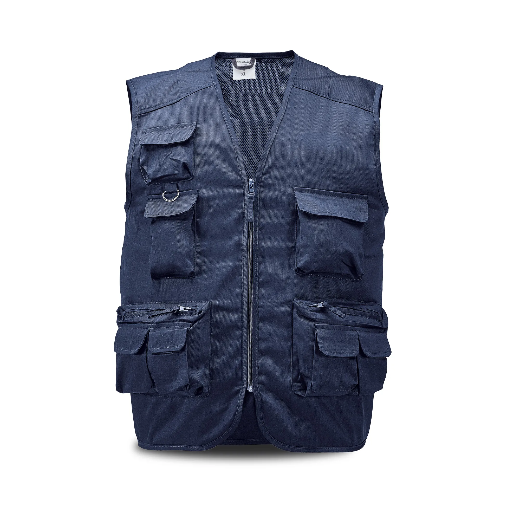 Colete multi-bolsos em sarja de algodão, fecho em nylon. Ótimo para colete de trabalho de quem precisa de ter várias ferramentas sempre à mão. Muitos bolsos com diversas dimensões. Fecho frontal. Composição: 35% poliéster e 65% algodão. Várias áreas de personalização.Colete multi-bolsos em sarja de algodão, fecho em nylon